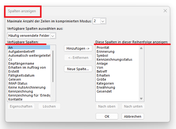 - Um die Sortierung zu ändern müssen Sie die gewünschten Objekte in dem unterstrichenden Bereich „Diese Spalten in dieser Reihenfolge anzeigen“ auswählen (per Linksklick) und gehen Sie auf die Button „Nach oben“ um das ausgewählte Objekt nach oben zu verschieben und „Nach unten“ um das ausgewählte Objekt nach unten zu verschieben.