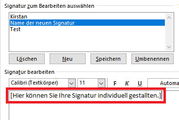 - Die individuelle Konfiguration können Sie in dem Eingabefeld unter „Signatur bearbeiten“ gestallten.