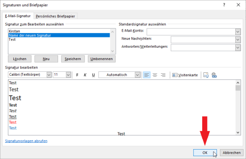 - Nach dem Konfigurieren bestätigen Sie ihre (Standard-)Signatur mit der Schaltfläche „OK“.