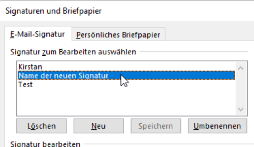 - Zu sehen ist Ihre neu benannte Signatur unter dem Bereich „Signaturen zum Bearbeiten auswählen“.