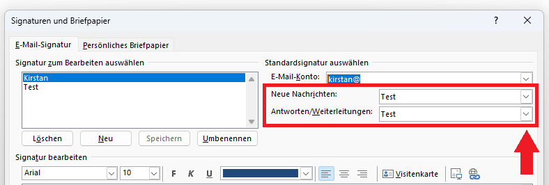 - Es öffnet sich erneut ein neues Fenster mit dem Namen „Signaturen und Briefpapier“ öffnen.